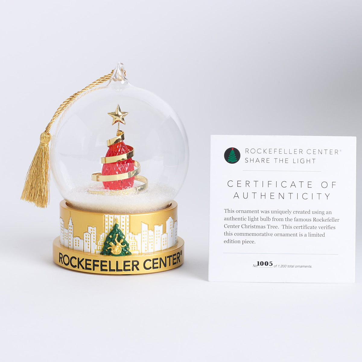 This year's annual commemorative "Share the Light" Rockefeller Center Christmas Tree ornament featuring an actual light bulb from the 2018 Christmas Tree.