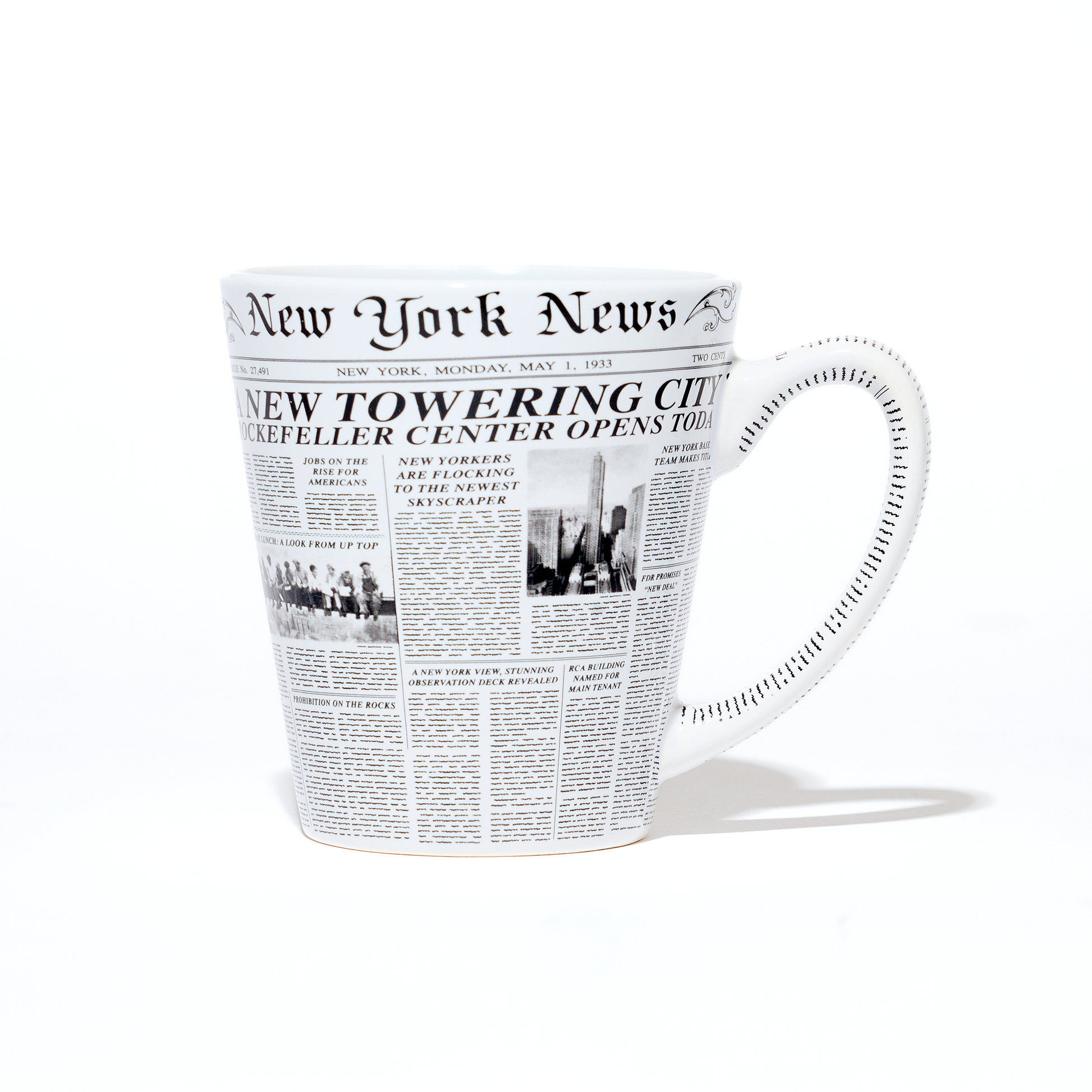 Start your day with a headline from history. This ceramic mug features a vintage-style newspaper design celebrating the 1933 opening of Rockefeller Center, making it a unique and timeless New York City souvenir.