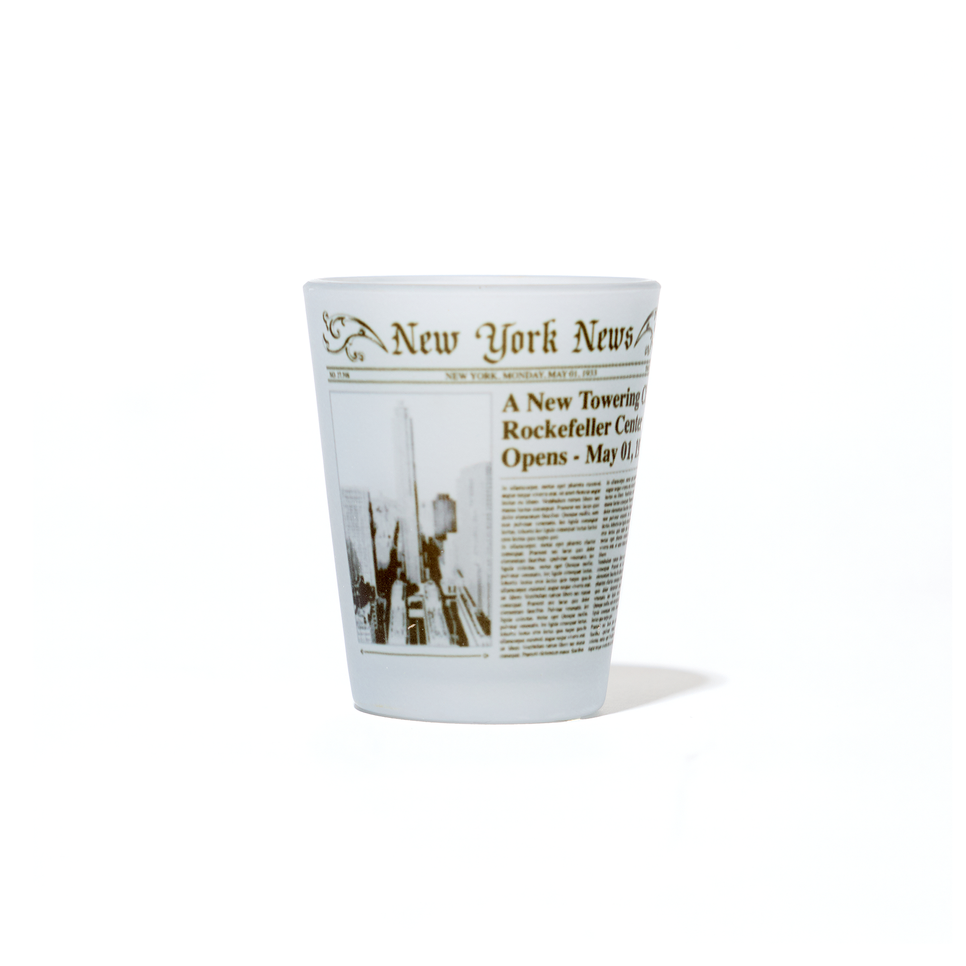 Celebrate the history of Rockefeller Center with this frosted shot glass, featuring a vintage-style newspaper headline announcing its grand opening on May 1, 1933. A unique keepsake that combines New York City charm with a touch of nostalgia.