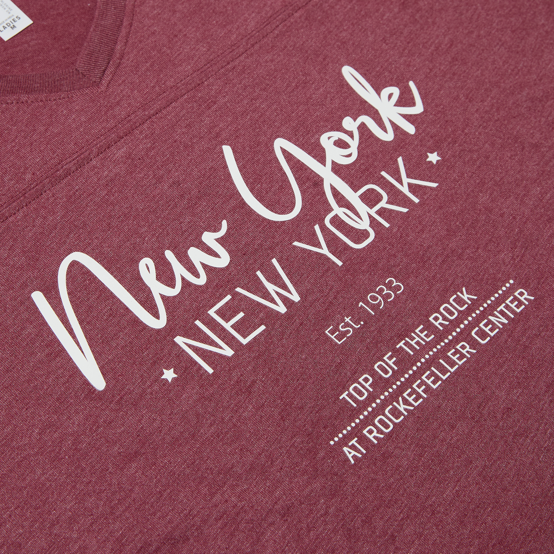 Show your New York pride with this sporty v-neck tee featuring double white stripes on the sleeves and a flattering cut. The soft maroon fabric is printed with “New York, New York – Est. 1933 – Top of the Rock at Rockefeller Center,” making it the perfect souvenir or everyday favorite.